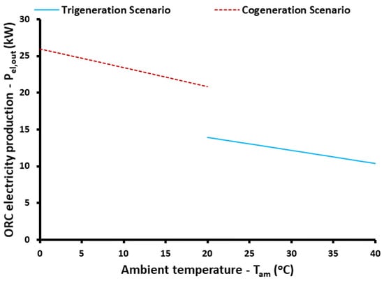 The impact of ambient temperature on ORC electricity production for both trigeneration and cogeneration scenarios.