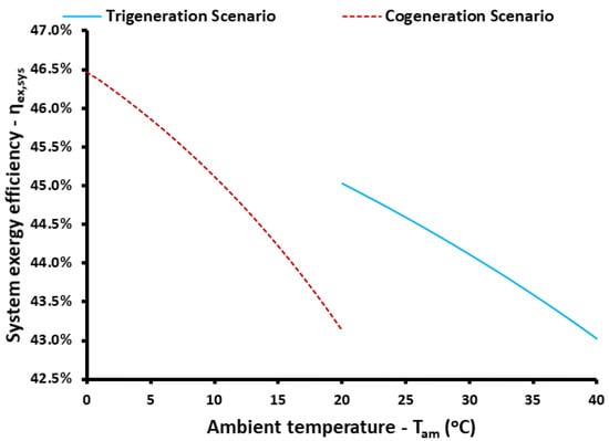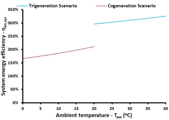 The next studied parameter is the exergetic efficiency for the studied cases and for different ambient temperatures. Figure 11 illustrates the exergy performance of the system; it is obvious that the rise of the ambient temperature reduces the exergy performance of the studied configuration. For the cogeneration scenario, the exergy efficiency ranged from 43.13% to 46.47%, while for the trigeneration scenario the range was from 43.03% to 45.03%. Figure 12 exhibits the system energy efficiency for the respective cases. The higher ambient temperature leads to higher performance, a result that contrasts the findings of the exergy efficiency. This result is a reasonable result because the present system operates mainly as a heating heat pump because it takes heat from the ambient and thus higher ambient temperature levels makes the intermediate compressor to consume lower amounts of electric power. In the trigeneration scenario, the energy efficiency ranged from 296.40% to 325.84%, while the cogeneration scenario range was from 166.51% to 211.74%. These values are greater than 100% because the system works mainly as a heat pump which is not restricted by the limit of 100%.