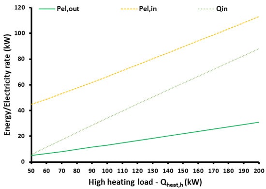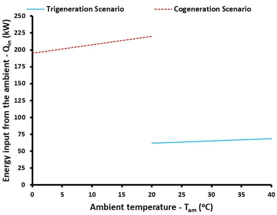 The next investigated parameter is the heat input in the unit from the ambient. This heat input plays a significant role in the system in order to counterbalance the load demand for heating (medium and high). Figure 8 illustrates the influence of high heating temperature on the ambient heat input; it is obvious that higher temperatures lead to a lower need for ambient energy input. This is an interesting result and shows that in cases with lower high heating temperatures, the ambient has an important role in the system’s performance. On the other hand, in cases of high operating temperature levels, the ambient cannot be an important source for the system and the electricity input is increased. Moreover, the cogeneration case needs higher amounts of ambient source input than the trigeneration case because trigeneration also takes input from the cold loads. The ambient source heat input ranged from 9.44 kW to 45.70 kW for the trigeneration case, while it varied from 174.50 kW to 223.00 kW for the cogeneration case.