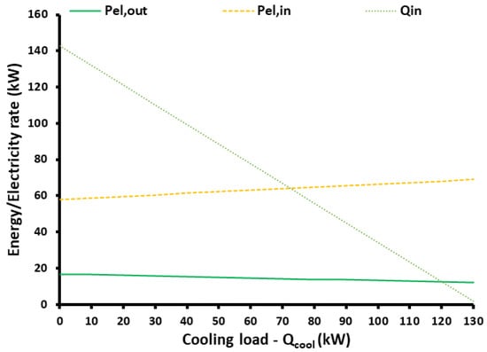 The simulation details, including all the simulation data, are presented in Table 2. Specifically, the selected efficiency values, the selected temperature levels and a range of other simulation parameters are included in this table. During simulations, different parameters are investigated in order to present the unit’s performance for various operating cases. In particular, the system is examined for different values of the high-temperature level (Theat,h) which is a crucial design parameter, as well as for different ambient temperatures. It is worth noting that for ambient temperature levels lower than 20 °C, it is assumed to have a cogeneration system, while for temperature levels above 20 °C the trigeneration operation is selected. This is a simple and practical technique in order to separate the two examined scenarios. Moreover, different values of the loads (Qcool, Qheat,m and Qheat,h) are examined. In the last step of this investigation, the operating margins of the unit are defined in order to map the possible operating conditions. Practically, the ambient heat input is a critical parameter that can be used to counterbalance and cover the needed loads.