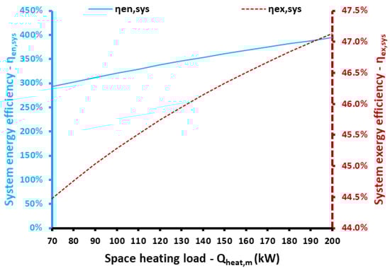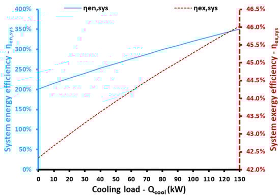 - The increase of the cooling load and of the space heat load led to higher energy and exergy efficiencies. However, the augmentation of the high heating temperature reduced both energy and exergy efficiencies.