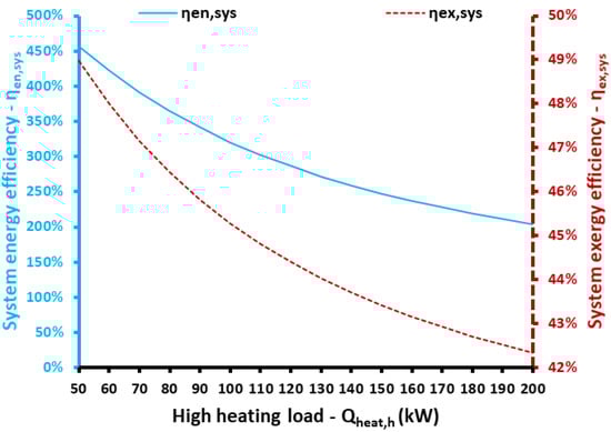 Figure 7 depicts the system energy efficiency for both of the examined scenarios. The energy efficiency of the system takes values above 100% because the present system acts, partially, as a heat pump and thus it is thermodynamically possible to achieve these high values. The trigeneration unit has greater energy efficiency than the cogeneration system because in the trigeneration system there are more useful products. Moreover, it is significant to state that a higher high heating temperature reduces energy efficiency, suggesting that the operation should use relatively low-temperature levels from an energy point of view. Specifically, the energetic efficiency ranged from 242.58% to 378.29% for the trigeneration case, while it varied from 146.72% to 213.09% for the cogeneration case.