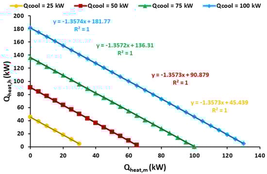 Figure 20 shows different operating lines of the system, with each corresponding to a different cooling load. Cooling loads of 25 kW, 50 kW, 75 kW and 100 kW are examined and in all cases, the operating lines are approximately vertical. In this analysis, Tam = 25 °C and Theat,h = 115 °C, with this combination used in the majority of cases of this work.