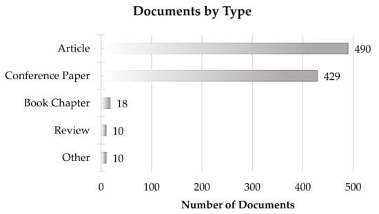 Distribution of the identified products by type of document. The category “Other” combines four results for “Errata”, three for “Books”, and one product for “Editorial”, “Note”, and “Retracted”, respectively.