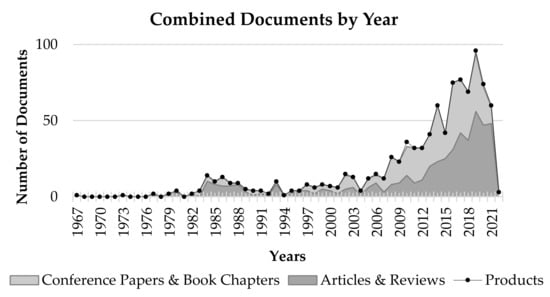 Distribution of the identified products by publication year. For the two subsets “Conference Papers and Book Chapters” and “Articles and Reviews”; results are presented in stacked form. The black line depicts the cumulative number of published documents each year.