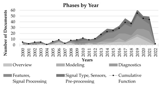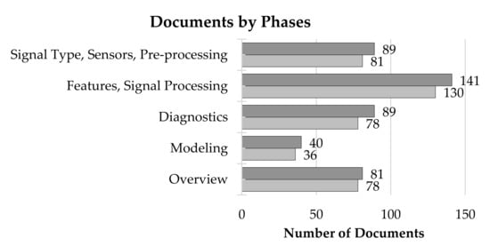 The analytical review analyzes, in more detail, the subsets of documents that were classified within the categories (p1) signal type, sensors, pre-processing, (p2) features, signal processing, and (p3) diagnostics. Those classes are in fact associated with the phases of the condition monitoring process most traditionally recognized, and over 70% of the total documents in the current dataset are classified within at least one of them.