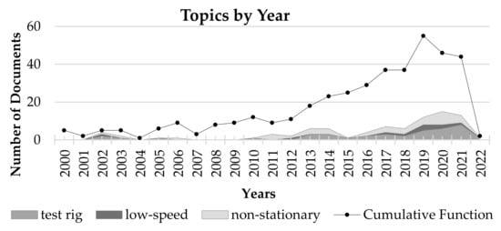 For the topics, a similar approach was used for the selection of the categories, although the initial choice of (t1) non-stationary, (t2) low-speed, and (t3) test rig was confirmed by the end of the literature review process. Moreover, the selection of these specific topics is motivated by the relevance of the subjects themselves more than by a pure rating factor.
