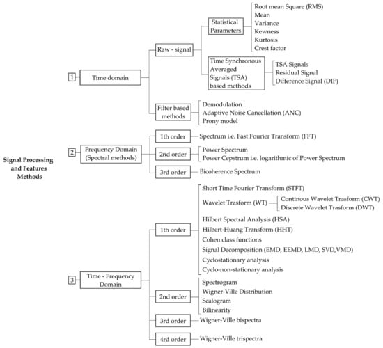 This category includes the methods for feature identification, extraction, and selection that are used in the second step of the monitoring process. Besides the most proper feature-related techniques, signal-processing methods can fall within this class, depending on the purpose of the user. For instance, statistical and frequency analysis techniques are classified in this category when used as a mean to highlight signal characteristics or compute quantities necessary for the following analysis steps.