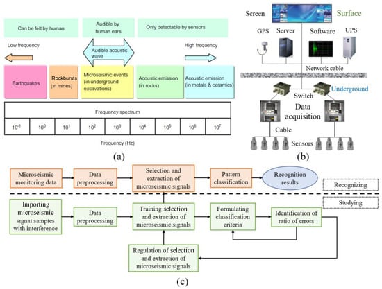 In situ monitoring for rockburst: (a) seismic motion wave frequency spectrum and field of application of AE/MS techniques (from []), (b) structure of a microseismic monitoring system in a mine (modified from []), (c) pattern recognition for microseismic signals (from []).