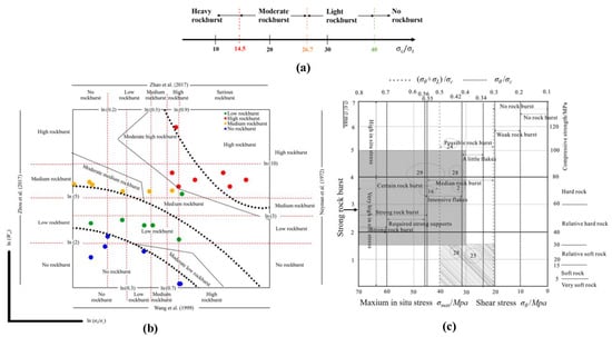 The single index empirical criterion method is mainly based on stress/strength, brittleness, energy and depth, including the Turchaninov criterion [], the Peng criterion [], the Russense criterion [], the Hoek criterion [], the elastic energy index [], the Tao criterion [], the Erlangshan criterion [], the potential stress failure index [] and the peak energy impact index [].