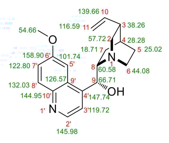 Chemical structure of quinine. The red numbers represent the atom numbering while the green numbers represent the 13C NMR chemical shift values.