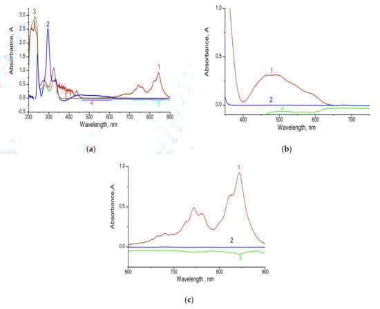 The oscillator strength () Equation (2) [7,17], and the transition dipole moment (μ, Debye) Equation (3) [7] of each complex were determined according to the equations: