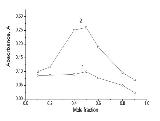 Stoichiometry of the complexes was determined graphically by plotting the absorbance (A) of the resulting complex (y-axis) against the molar ratio of the acceptor/donor to complex (x-axis) as indicated by Job’s method. The donor to acceptor ratio was 1:1 in both cases (Figure 3). The association constant of the CT complex was calculated using the modified Benesi- Hildebrand method. It was evaluated at room temperature (25 ± 2 °C) and at the maximum of CT complex in acetonitrile using the following Equation (1) [23]: