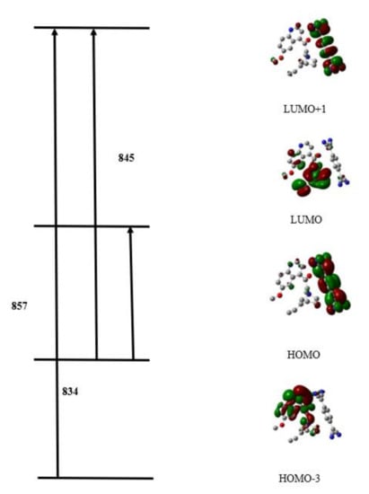 It is known that with TD-DFT functional theory [20,28,29], a reliable determination of the UV-Vis absorption spectra is generally possible. The frontier molecular orbital (FMO) energies and descriptions are given in Figure 9. TD-DFT calculations were used to analyze the observed UV-visible spectrum of the Q-DDQ and Q-TNCQ complexes.