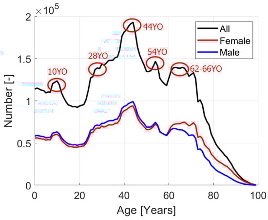 Figure 1 shows the representation of the age groups in the Czech population. The peaks show the highest representation for 10, 28, 44, 54 and 62–66 years old (further referred to as YO) for both males (M) and females (F). As the comparison concerns frontal seat impact, the youngest group was selected to be in-line with the Czech Republic regulation for the front seat height limit, which is a passenger higher than 150 cm. Thus, the youngest age group was chosen in order to have the female higher than 150 cm (here 14–15 YO). Additionally, percentiles P50 and P95 for the males and P5 of the females from each age interval (in correspondence with the dummy size) were implemented. The particular intervals are defined from the Virthuman model and its internal scaling algorithm, where the age is defined in the intervals (not a single value) []. Thus, the specified age groups are selected based on Figure 1, but defined with respect to the Virthuman model scaling, where the ages are defined by the intervals. The list of the selected occupants are as follows, in Table 1: