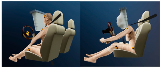The model is seated as a driver and fastened with a seatbelt using a semi-automatic tool build implemented in the VPS software with the default material properties of the seat belt. For simplicity, the seat is considered rigid. In order to represent a more realistic case, the hands were considered to be in contact with the steering wheel []. The seat belt consists of the membrane elements (in the part of contact with the body) and bar elements (in the connection to a retractor, slipring and buckle, respectively). The material characteristics of these structures are defined (and previously validated in VPS software).