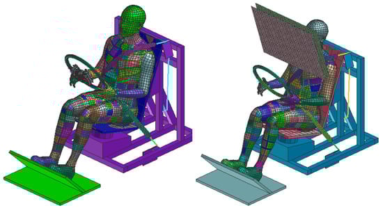 For the assessment of the safety performance, the nanobag support frame is considered a rigid body, and the nanobag is considered to be deployed at the beginning of the simulation. The process of the deployment (unfolding) of the nanobag was not considered in this study. The inclination of the nanobag support to the cushion seat is 25° for the inner layer and 30° for the outer layer. The position of the seat and the nanobag was equal for all the configurations. In order to respect the adjusting of the seat and to model the experimental test correctly, the footrest was adjusted closely to the feet (the feet are in the close contact with the footrest); see Figure 3. The nanobag rigid frame is considered to be fixed to the car roof (into the reinforcement). However, since this system is still under development and not has been tested and certified, the particular design and method of fixing to the frame is not considered in this study.