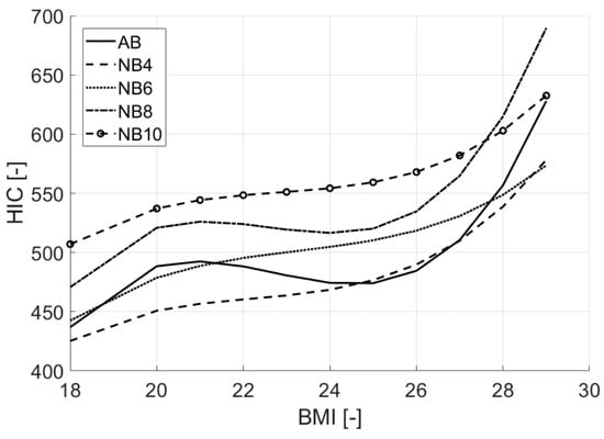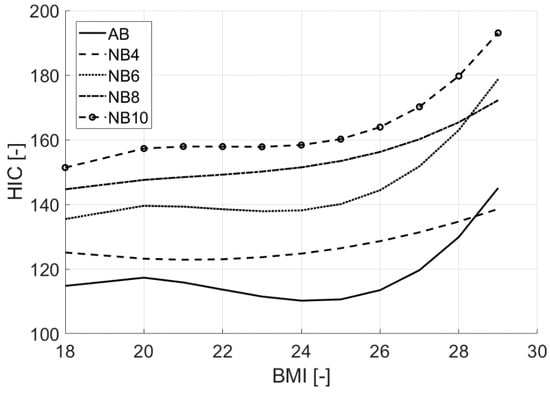 In order to assess the effect of the airbag and nanobag for various anthropometry, respectively, the plot of body mass index (BMI) vs. head injury criterion (HIC) are depicted. The BMI pairs the height and weight of the subject, and both are considered to be assessed for the safety effect; see Figure 5. All the curves report increasing the HIC value for higher a BMI for both safety systems. The approximation curve is the lowest in the case of the airbag, followed by the 4-layer nanobag. With increasing numbers of layers, the HIC values tend to increase (more layers, stiffer obstacle and higher head acceleration). However, all values are still within the acceptable region of head injury risk of <1000 []. The best protection is predicted for a standard airbag for a BMI up to 29. After this limit, the HIC predicts lower values for the nanobag with 4 layers.