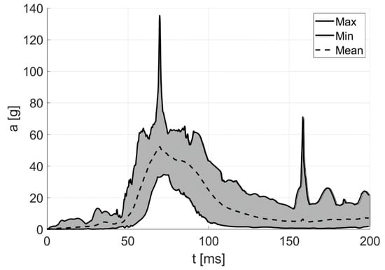 Head acceleration results in the time dependence curve of its COG versus time. The plot on Figure 4 shows the limits (maximum and minimum values) of all the configurations as well as their mean values. This plot shows that all the cases have a similar curve shape, and there is not a one curve, which would behave in very different manner.