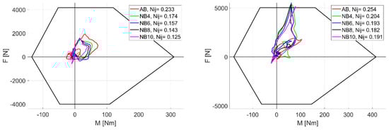 The Nij curves are significantly higher than in case of 30 km/h; however, they still lay inside the corridors. There is only one configuration where the curves cross the corridors (M, P95, 54 YO, 184 cm, 95 kg); see Figure 8, where also the results of Male, P50, 28 YO, 178 cm, 76 kg (standard dummy size) are plotted as a reference.