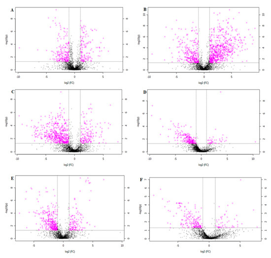 Volcano plots of metabolites detected in cultivars for different comparisons: (A) Autumn Bliss vs. Autumn Britten; (B) Autumn Bliss vs. Red Autumn; (C) Autumn Britten vs. Red Autumn; in negative ion mode: (D) Autumn Bliss vs. Autumn Britten; (E) Autumn Bliss vs. Red Autumn; (F) Autumn Britten vs. Red Autumn; in positive ion mode. The vertical dotted lines indicate fold change of 1.5, and the horizontal dotted line indicates p = 0.05.