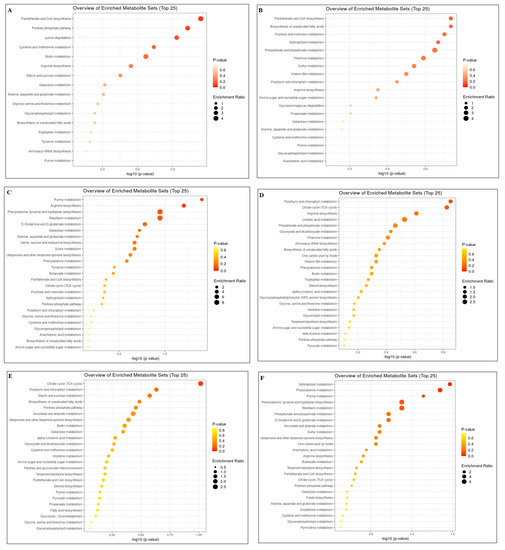 Metabolic pathway analysis of different comparisons of three cultivars. (A) Autumn Bliss vs. Autumn Britten (up-regulation metabolites); (B) Autumn Britten vs. Red Autumn (up-regulation metabolites); (C) Autumn Bliss vs. Red Autumn (up-regulation metabolites); (D) Autumn Bliss vs. Autumn Britten (down-regulation metabolites); (E) Autumn Britten vs. Red Autumn (down-regulation metabolites); (F) Autumn Bliss vs. Red Autumn (down-regulation metabolites).