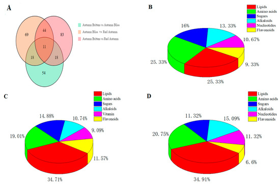 Comparison of classification of identified differential metabolites. (A) Venn for metabolites between different varieties. (B) Pie graph for specific metabolites in Autumn Britten vs. Autumn Bliss. (C) Pie graph for specific metabolites in Autumn Britten vs. Red Autumn. (D) Pie graph for specific metabolites in Autumn Bliss vs. Red Autumn.