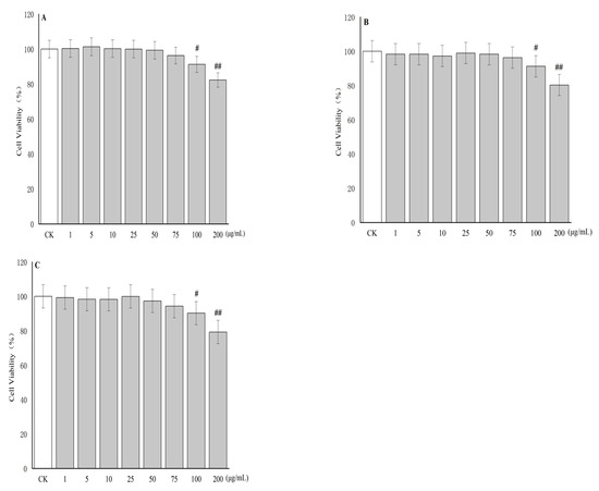 Cytotoxicity assessment of L929 fibroblasts treated with different concentrations of RLEE. The fibroblasts were determined by CCK-8. Readings on a spectrophotometer at 450 nm. ((A): Autumn Britten; (B): Autumn Britten; (C): Red Autumn, CK: control group: untreated cells. RLEE: 1–200 μg/mL RLEE treated cells. # p < 0.05, ## p < 0.01, significant difference compared to CK).