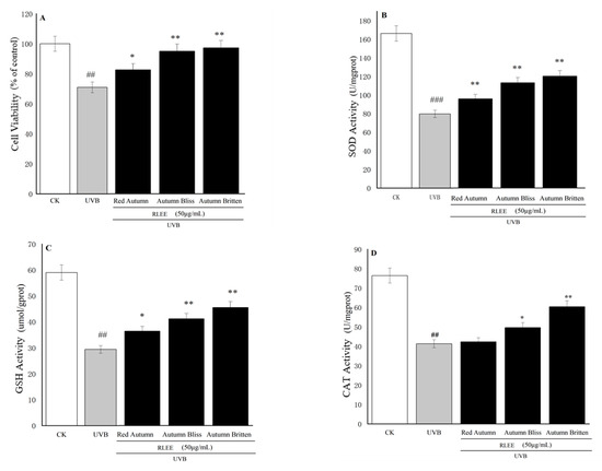 Cell viability and antioxidant enzyme activity of L929 fibroblasts treated with different varieties of RLEE (50 μg/mL); (A): cell viability (B): SOD Activity (C): GSH Activity (D): CAT Activity. SOD activities were expressed in terms of U/mg protein, U means that when the SOD inhibition rate reaches 50% in the reaction system, the corresponding enzyme amount is an activity unit (U); GSH activity were expressed in terms of μmol/g protein; CAT activity were expressed in terms of U/mg protein, U means 1 μmol of H2O2 per milligram of cellular protein per second is an activity unit (U). (CK: control group: untreated cells; UVB: exposed only to UVB without RLEE protection; ## p < 0.05, ### p < 0.01, significant difference compared to CK, * p < 0.05, ** p < 0.01, significant difference compared to UVB group).
