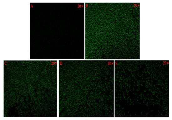 Effects of RLEE on ROS fluorescence intensity in UVB injury protection group (A): control; (B): UVB; (C): UVB + 50 μg/mL Red Autumn RLEE; (D): UVB + 50 μg/mL Autumn Bliss RLEE; (E): UVB + 50 μg/mL Autumn Britten RLEE.