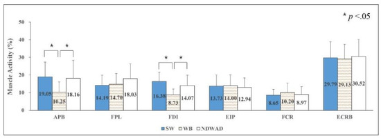 | Muscle Activity (%) | SW | WB | NDWAD | F | p | Post-Hoc (Tukey) |