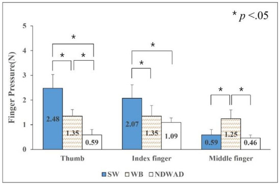 | Finger Pressure (N) | SW | WB | NDWAD | F | p | Post-Hoc (Tukey or Mann Whitney U) |