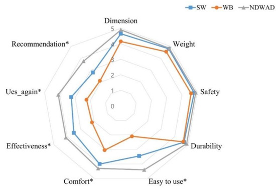 | Items | SW Mean ± SD (Range) | WB Mean ± SD (Range) | NDWAD Mean ± SD (Range) | Chi-Square | p |