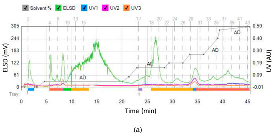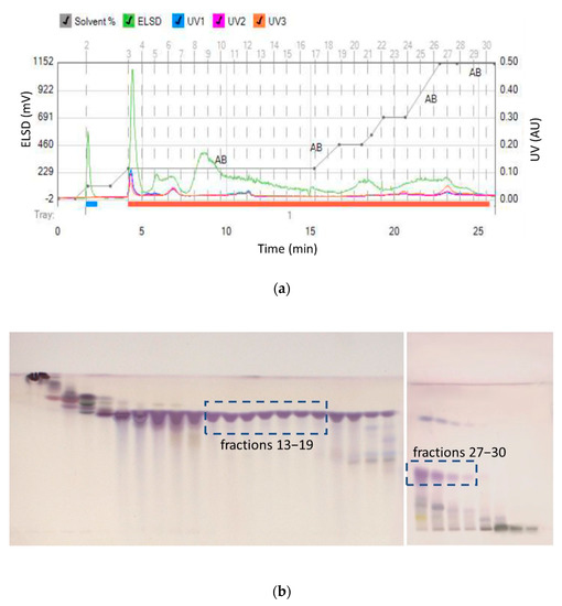 In order to selectively remove more polar compounds (lower RF values on the HPTLC plate) from the ethyl acetate extract while retaining others, water was used as the wash solvent. Aqueous washing is used to remove water soluble compounds from organic phase, since maslinic acid will be dissolved in the organic layer. The goal was to remove interferents present in the fractions containing maslinic acid. Olive leaves were extracted using a mixture of ethyl acetate and water (1:1), with only the ethyl acetate phase separated using flash chromatography. Furthermore, 10% of acetic acid was added to the ethyl acetate mobile phase to improve the separation efficiency and peak shape of ionizable organic acids. When separating acidic compounds, adding a small amount of a volatile organic acid to the solvent system will minimize any secondary H-bonding interactions with the silica by keeping the acids protonated. Oleanolic acid started eluting at 8% of ethyl acetate/acetic acid (mobile phase D), while maslinic acid started eluting at 31% ethyl acetate/acetic acid (Figure 4). Maslinic acid was present in a pure form in the fractions 18–20. In a single chromatographic run, a yield of 6.25 mg/g pure maslinic acid was obtained from the crude extract. This is comparable to previously reported maslinic acid yields of 9.2 mg/g using optimized ultrasonic assisted extraction and then centrifugation [25], and 8.5 mg/g using solid–liquid, then ultrasonic-assisted extraction [29]. Moreover, our yield was significantly higher than previously reported yields of 1.2–1.5 mg/g [19] and 0.034 mg/g [26] using solid–liquid extraction (maceration), and yields of 0.295–0.904 mg/g using solid–liquid extraction (centrifugation) [27] and ultrasonic assisted extraction [28].