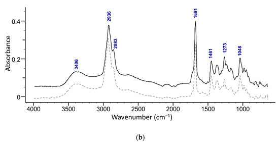 The Fourier Transform Infrared spectra (FTIR) of the samples were recorded on a Cary 630 FTIR Spectrometer (Agilent Technologies Pty Ltd, Mulgrave, Australia) fitted with a diamond ATR accessory. Spectra, in the absorbance mode, were recorded from 4000 to 650 cm−1, by accumulation of 64 scans at a resolution of 4 cm−1. The baseline correction, ATR correction, and the spectra average were performed using the Resolution Pro FTIR Software program (version 5.2.0, Agilent Technologies Pty Ltd., Mulgrave, Australia).