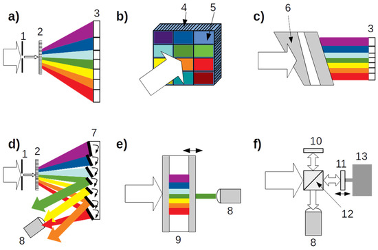 Fundamental schematics of major emerging technologies: (a) conventional, with slit (1), diffraction grating (2) and array sensor (3); (b) filter array (5) upon a CMOS photographic sensor (4); (c) linear variable filter (LVF) (6) and array sensor (3); (d) digital micromirror device (7), with slit (1), diffraction grating (2) and photodiode (8); (e) coupled micro-electro-mechanical systems (MEMS)-based Fabry–Pérot etalon (9) and photodiode (8); (f) MEMS-based Michelson interferometer, constituted by a fixed mirror (10), beam-splitter (12), photodiode (8) and movable mirror (11) moved by a MEMS (13).