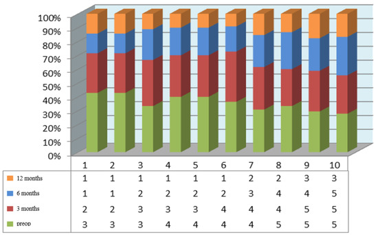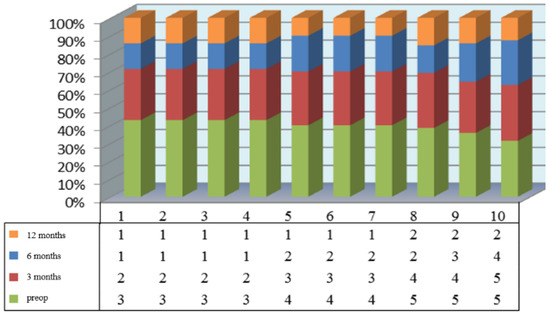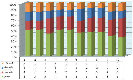 Table 2 shows the PAI score at different time intervals; it has a linear regression decreasing from preop to 3, 6 and 12 months post-therapy.