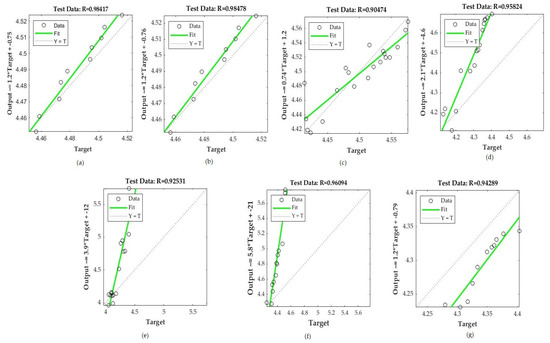 Performance of the ANFIS model in the testing phase: (a) dataset 1, (b) dataset 2, (c) dataset 3, (d) dataset 4, (e) dataset 5, (f) dataset 6, and (g) dataset 7.