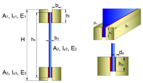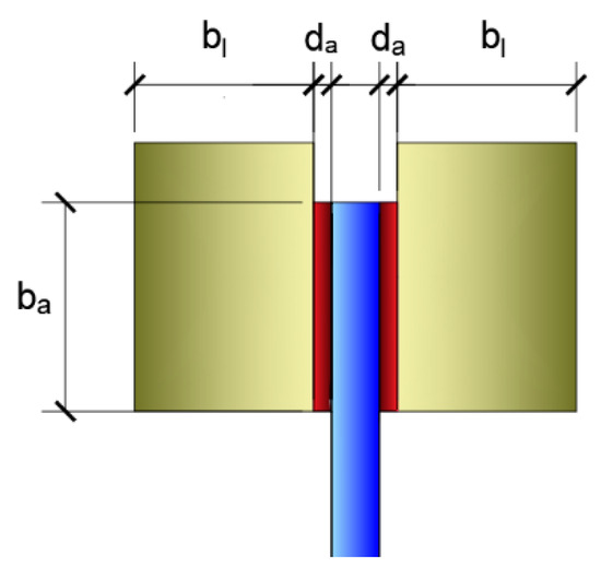 The shear modulus of the adhesive G and the dimensions given in Figure 4, adhesive thickness da, adhesive height ha, adhesive length ba, determine the gamma factor (γi) of the adhesive or the stiffness of the adhesive.