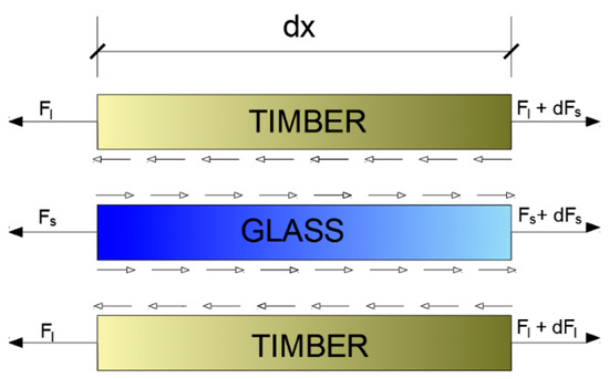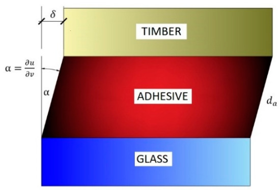 Referring to Figure 2 and assuming small displacements and constant shear strains through the thickness of the adhesive joint, the relative displacements between timber and glass can be described as follows: