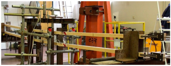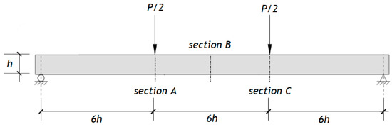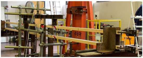 The bending tests for both specimens TGIB-fw and TGIB-gf were carried out according to the recommendations of EN 408 [33], which prescribe the performance of a four-point bending test, as shown schematically in Figure 5. The distance between the supports was 18 h (4320 mm) and the loading points were located in a third of the span.