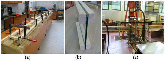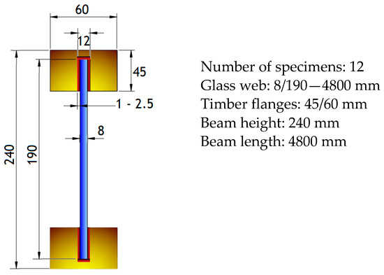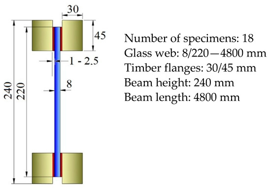 Basically, 18 test specimens were made from finger-jointed C24 timber with two different types of glass and three different adhesives. For comparison purposes, the test specimens were 4800 mm long and 240 mm high. They consisted of two types of 8 mm thick glass. Annealed float glass and fully tempered glass were used. The edges of both types were polished. Timber flanges measuring 30 mm × 45 mm were glued to the glass web. The cross section is shown in Figure 6.