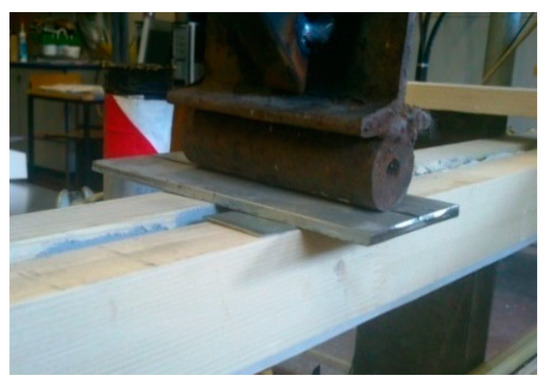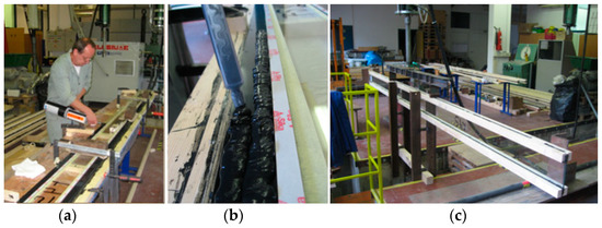 Figure 7 shows a cross-section of a timber- glass I-beam, with a groove in the flange. This type of beam was used for comparison. All beams were 240 mm high and 4800 mm long. Two types of glass were used for the beams: annealed float glass (AF) and heat-strengthened glass (HS), 190 × 4800 mm with a thickness of 8 mm. The edges were polished. Finger-jointed pine studs 45 × 60 mm thick were used for the timber flanges. A 12 × 20 mm groove was cut in the flanges for mounting the glass pane. Thus, the thickness of the adhesive strip for all beams was 2 mm (on both sides of the glass strip). Three different types of adhesives with different stiffnesses were used for bonding: 3M DP490 (epoxy), SikaFast 5221 (acrylate) and Sikasil SG-500 (silicone).
