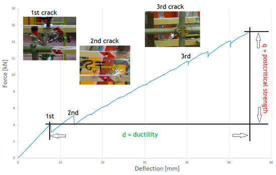 In fully tempered glass no post-critical strength is observed here. The first crack corresponds to the final failure, as shown in Table 8. This value, Fmax, can be up to twice the value for the annealed float glass sample. Fcrack and Fmax are therefore the same. Therefore, the parameter q = 1.0 and the ductility d = 1.0 for all test samples and are thus not specially presented in Table 7.