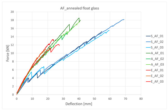 Diagram force vs. deflection for the annealed float glass (adhesive: S—silicone Sika Sil SG500, A—acrylate Sika Fast 5215, E—epoxy Sikadur®-31 CF Normal, AF—annealed float glass).