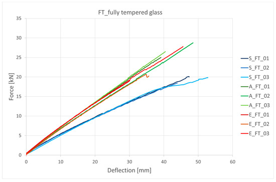 Diagram force vs. deflection for the fully tempered glass (adhesive: S—silicone Sika Sil SG500, A—acrylate Sika Fast 5215, E—epoxy Sikadur®-31 CF Normal, FT—Fully.