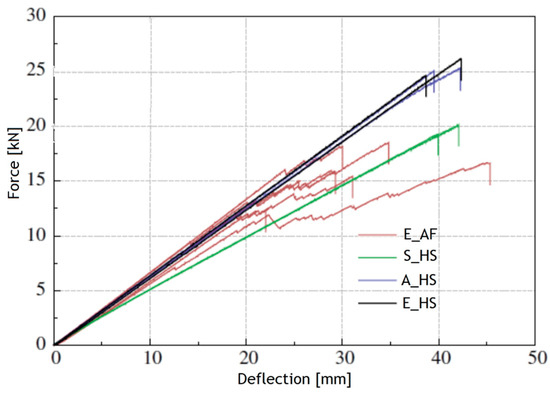 Beam tests TGIB-fg [18] (E—epoxy (3M DP490), S—silicone (Sika Sil SG500), A—acrylate (Sika Fast 5215) adhesive; AF annealed, HS heat strengthened float glass).