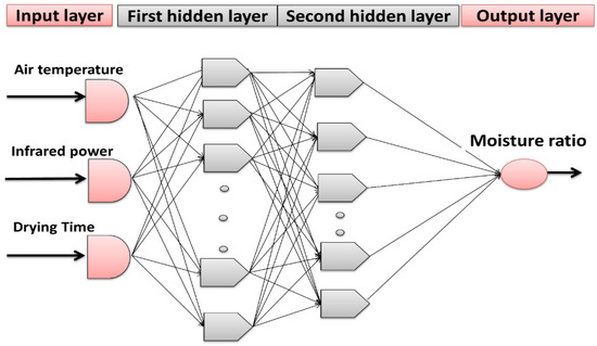 Determining the number of neurons and layers is the main important issue for designing ANN algorithms [41]. The number of neurons has a direct impact on ANN algorithm learning. For instance, if fewer neurons are considered then the time of the network is reduced while the network has not learned enough, and the network has not faced all the possible cases. Selecting a high number of neurons then the calculation takes more time and extra memory capacity is required however it results in excellent learning [42]. Overall, trial and error are used to determine the number of neurons and layers [43]. The perceptron multilayer neural network is an FFBP or CFBP with three inputs (infrared power, air temperature, and drying time), one or two hidden layers, and one output layer. However, there was no general rule for choosing the number of neurons in the hidden layer. Both the input and output were considered to have one neuron, and the stepwise searching method was used to determine the optimal number of hidden neurons in the range of 3–15 (trial and error) [41]. Also, ANN will finish the procedure of the network after reaching a minimum error and maximum R2 value
