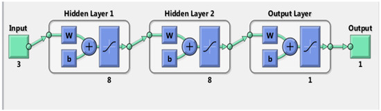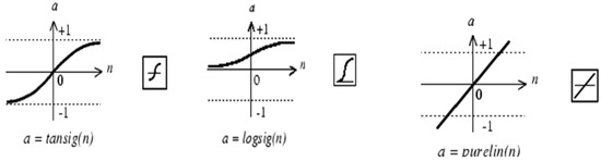 During the training process, these weights and the constant values that are added to them, called biases, change continuously until the error is minimized. After obtaining each Xj, an activation function is used for modifying it. To optimize the network structure, three activation functions of the hyperbolic tangent sigmoid (Tansig (TAN)), logarithmic sigmoid transfer function (Logsig (LOG)), and linear function (Purlin (PUR)) were used (Figure 4) [28].