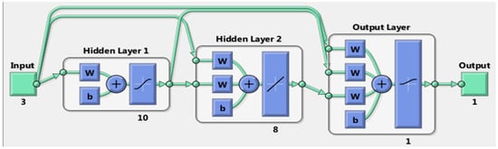 CFBP: These networks, like the feedback network, use an error back-propagation algorithm to update the weights. But the main feature of this network is that the neurons in each layer are connected to all the previous layer neurons (Figure 3) [40]. The activation functions and algorithms used for the CFBP network are similar to those for the FFBP network. It is noteworthy that due to the increase in interneuron connections, the network used becomes more complex because its computational volume increases [37].